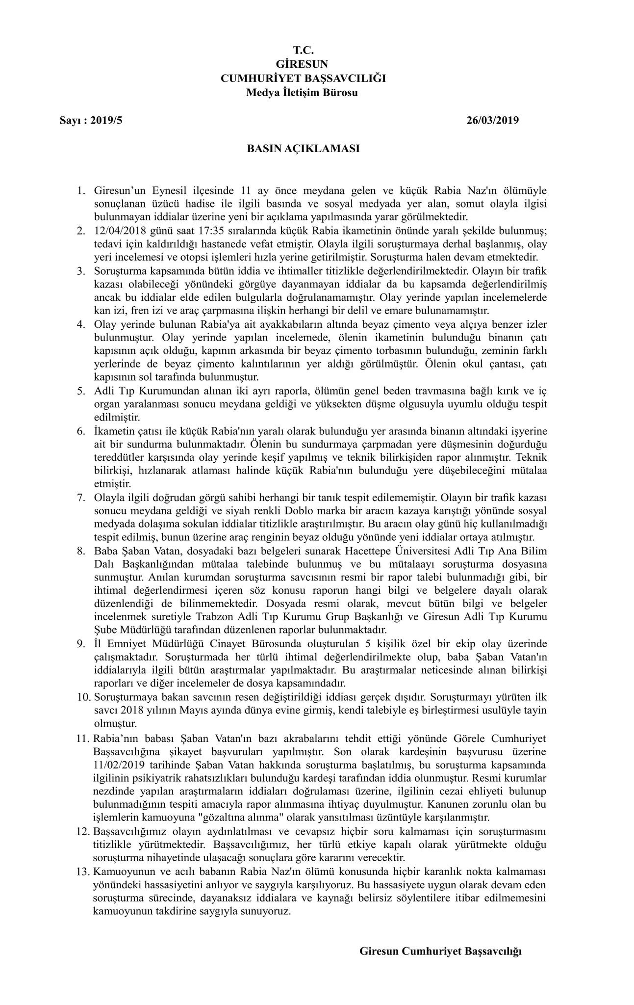 Giresun Cumhuriyet Başsavcılığı’ndan yapılan açıklamada, Rabia Naz Vatan’ın ölümüne ilişkin, “Başsavcılığımız olayın aydınlatılması ve cevapsız hiçbir soru kalmaması için soruşturmasını titizlikle yürütmektedir.” denildi.