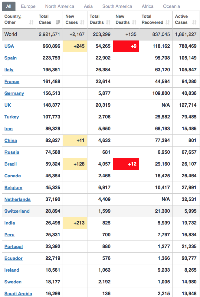 Ülkeler – Toplam Vaka – Yeni Vaka – Toplam Ölüm – Yeni Ölüm – Toplam İyileşme – Aktif Vakalar