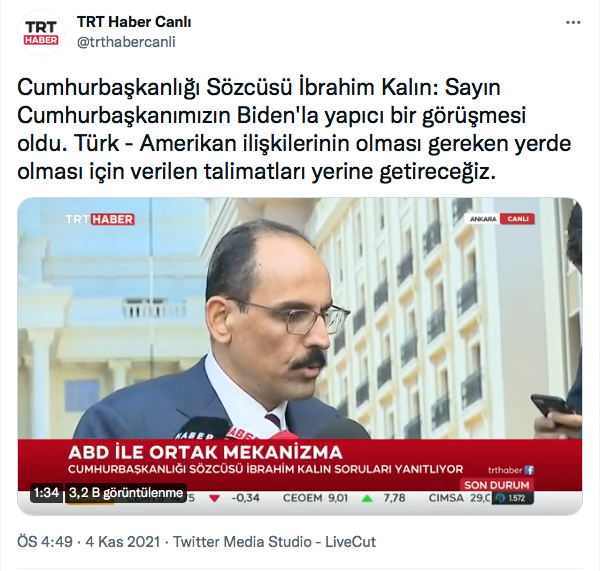 “Cumhurbaşkanımızın Biden’la yapıcı bir görüşmesi oldu. İki lider Türk-Amerikan ilişkilerinin doğru bir stratejik çerçeve içine oturtma konusunda da mutabık kaldılar. Dışişleri Bakanlığıımızın koordinasyonunda en kısa zamanda kurulacak. Dostları çoğaltarak bir dış politika izliyoruz. Amacımız, ülkemizin menfaatlerini, çıkarlarını öne alarak herkesle iyi ilişkilerde bulunmak.”