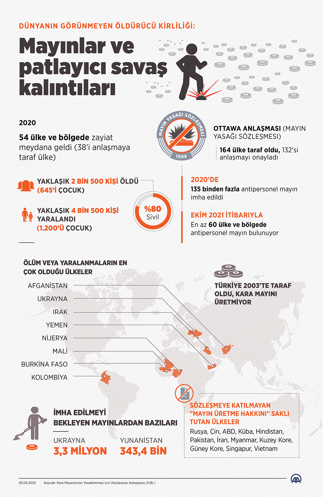 Kara mayınları ve patlayıcı savaş kalıntıları uluslararası anlaşmalarla yasaklanmış olmasına karşın tehlikesini sürdürürken; 2020’de mayınlar nedeniyle dünya genelinde yaklaşık 2 bin 500 kişi öldü, 4 bin 561 kişi yaralandı. Aralarında ABD ve Rusya’nın olduğu 12 ülke kara mayını üretme hakkını saklı tutuyor.