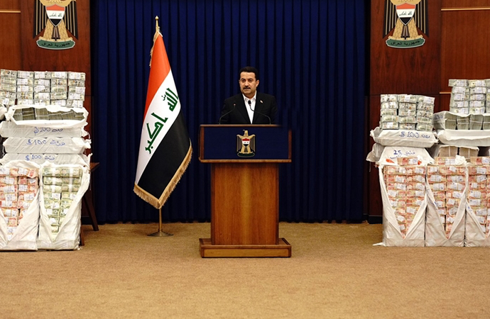 Irak Başbakanı Muhammed Şiya es-Sudani, başkent Bağdat’ta düzenlediği basın toplantısında, iade edilen paralarla gazetecilerin karşısına çıktı.