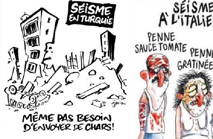 Daha önce de Hazreti Muhammed’e yönelik hakaret içerikli karikatürler yayımlayan Charlie Hebdo, binlerce kişinin hayatını kaybettiği Türkiye’deki depremleri nefret diliyle karikatürize ederek Twitter hesabından, “Türkiye’de deprem” başlığıyla, yıkılan binalar ile devrilen bir aracın bulunduğu çizimi “Tank göndermeye ihtiyaç kalmadı.” ifadesiyle paylaşmıştı.