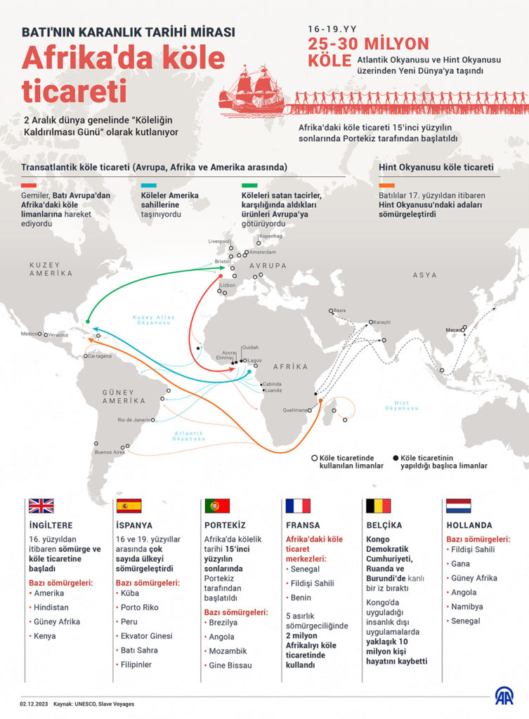 Batılı güçlerin, 1500’lerin başı ile 1860’lar arasında yaklaşık 25-30 milyon kişiyi transatlantik köle ticaretiyle Atlas Okyanusu’nun diğer kıyısına taşıdığı tahmin ediliyor.