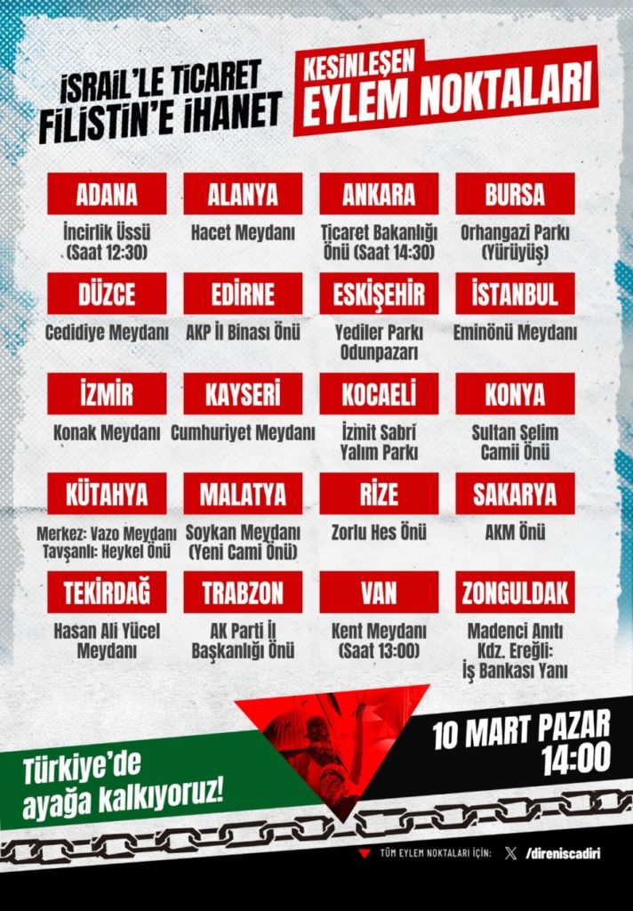 “İsrail’le Ticaret, Filistin’e İhanet! Soykırıma Karşı Duruşunu Şehrinin Meydanında Barışçıl Yollarla Göster” başlığıyla çağrı yapılan gösteri; Adana, Alanya, Ankara, Düzce, İstanbul, İzmir, Edirne, Kastamonu, Kocaeli, Malatya, Urfa, Sakarya, Tekirdağ, Bursa, Trabzon, Eskişehir, Niğde, Rize, Van Zonguldak’ta aynı gün aynı saatte gerçekleştirilecek.