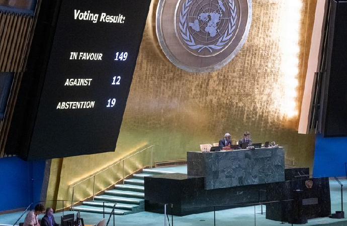 Olağanüstü acil özel gündemle toplanan Genel Kurul’daki oylamada BM’ye üye 193 ülkeden 149’u “evet” oyu ile tasarıya desteğini ortaya koyarken 12 ülke karşı çıktı ve 19 ülke de çekimser kaldı.