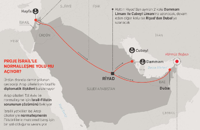 İsrail’in İran’a saldırısıyla başlayan ve 12 gün süren çatışmaların ateşkesle sonuçlanmasının ardından, Batı dünyası İran’ın Hürmüz Boğazı’nı kapatma ihtimalini bahane göstererek Körfez petrolünü bu demiryolu hattı üzerinden Akdeniz’e taşıma fikrini güçlendirmeyi hedeflemektedir. Bu hat, beş gün içinde malların Akdeniz’e ulaşabilmesi sayesinde deniz yoluna kıyasla yüzde 30 daha hızlı olacak ve yıllık 15 milyon ton taşıma kapasitesine ulaşacaktır. Sonuç olarak, İsrail’in uzun süredir hayalini kurduğu Doğu Akdeniz’in lojistik merkezi olma hedefi bu projeyle birlikte Körfez ülkelerini de içine alan jeoekonomik bir ittifaka dönüştürülmek istenmektedir. ABD ise ticaret koridorlarının merkezine İsrail’i yerleştirerek hem ekonomik meşruiyet sağlamak hem de İsrail’in güvenliğini tahkim etmek niyetindedir.