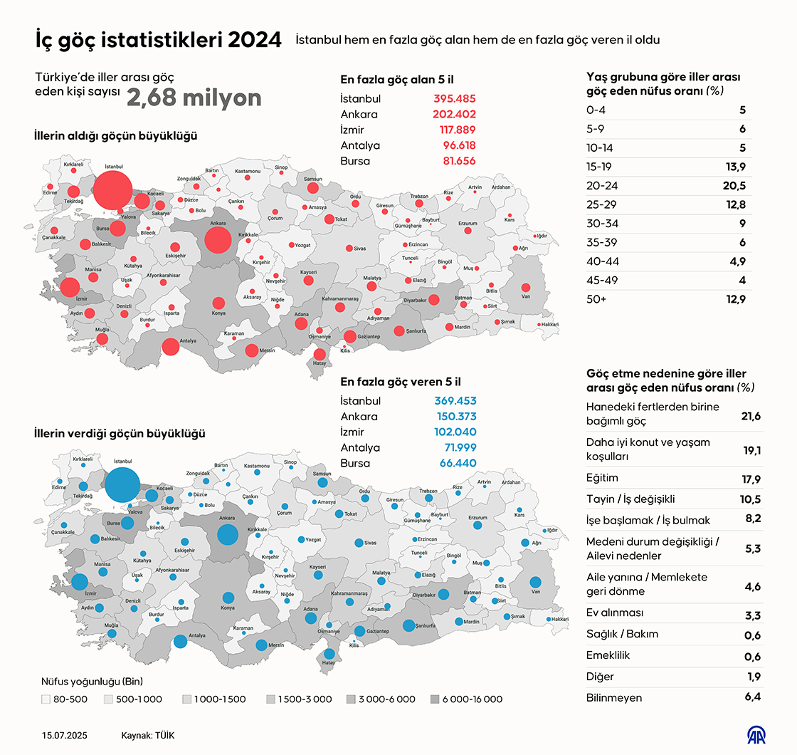 Türkiye’de 2024 yılında iller arası göç eden 2 milyon 682 bin 673 kişiden 579 bin 507’si hanedeki fertlerden birine bağımlı göç etti. Diğer göç etme nedenleri incelendiğinde, 512 bin 370 kişinin daha iyi konut ve yaşam koşulları, 479 bin 622 kişinin ise eğitim nedeniyle göç ettiği görüldü.