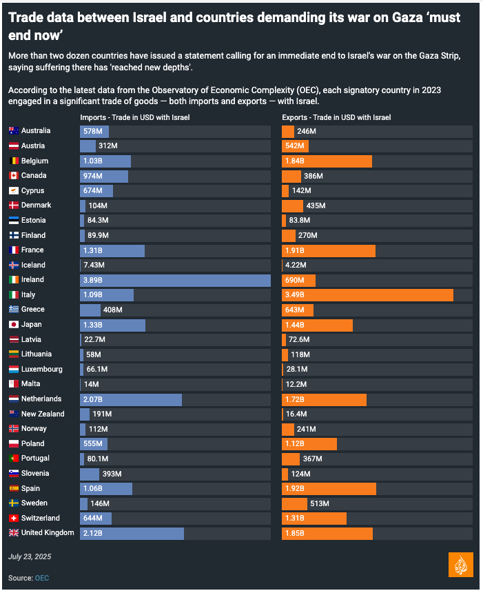 Ekonomik Karmaşıklık Gözlemevi’nin 2023 rakamlarına göre Belçika, Fransa, İrlanda, İtalya, Japonya, Hollanda, Polonya, İspanya, İsviçre ve Birleşik Krallık’ın İsrail ile 1 milyar dolardan fazla ithalatı, ihracatı veya her ikisi birden bulunuyor.