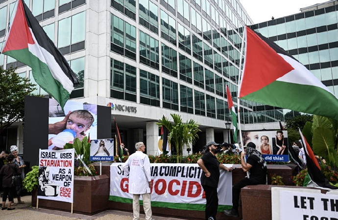 ABD medyasında İsrail’in Gazze’ye saldırılarına ilişkin haberlerin taraflı olmasını protesto eden göstericiler, “Soykırıma medyanın suç ortaklığını durdurun.” ve “Medya yalan söylüyor, Gazze ölüyor.” yazılı dövizler taşıdı.