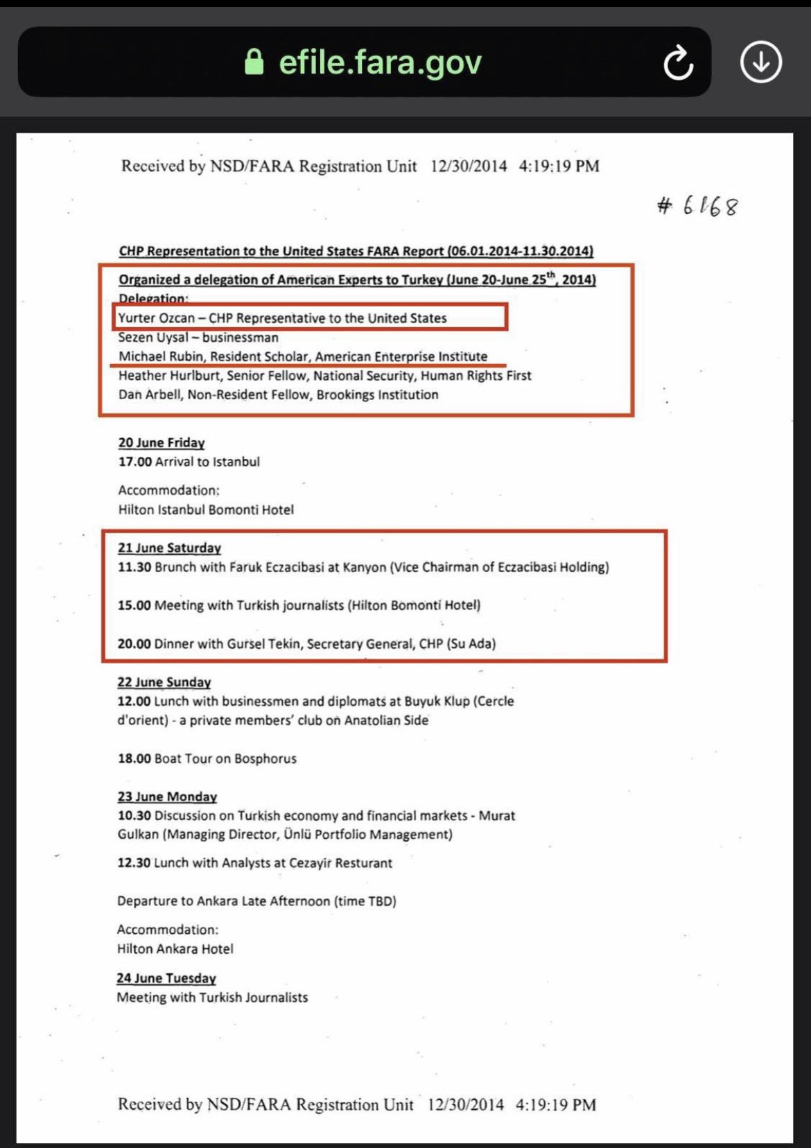 Söz konusu fotoğrafın hikayesi ise şu şekildedir; ekteki resmi program ile de sabit olduğu üzere ilgili heyet resmi ziyaret kapsamında 20 Haziran 2014’te İstanbul’a gelmiş olup; 5 gün boyunca Eczacıbaşı, Büyük Kulüp’te iş dünyası ve diplomatlarla yemek, CHP genel başkanı ve genel başkan yardımcılarıyla yemek gibi bir dizi resmi ziyarette bulunmuşlardır. Bu program FARA nezdinde resmi olarak da kayıtlı bir programdır.