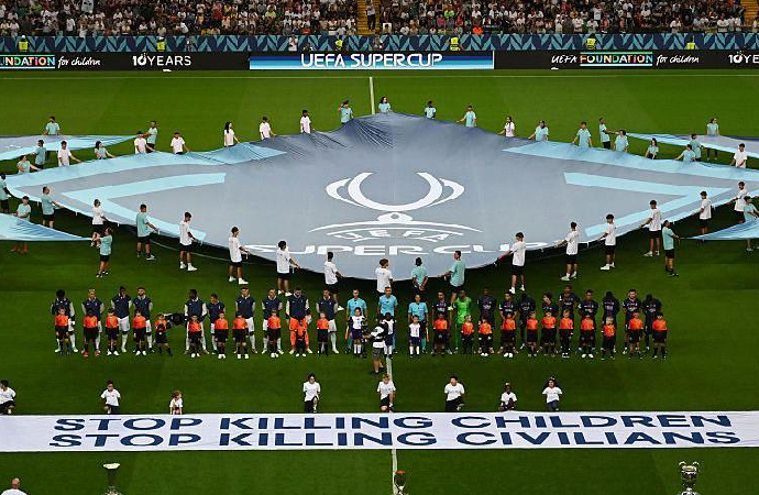 UEFA, İsrail tarafından öldürülen Filistinli bir oyuncu için yaptığı mütevazı anma töreninin ardından, İtalya’nın Udine kentinde oynanan Paris Saint-Germain ile Tottenham arasında oynanan Süper Kupa maçı öncesi sahaya “Çocukları Öldürmeyi Durdurun. Sivilleri Öldürmeyi Durdurun” yazılı bir pankart açmak zorunda kaldı.