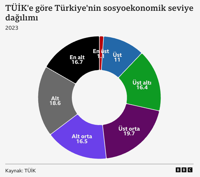 Verilere göre Türkiye’deki hanehalklarının %1,1’i en üst; %11’i üst sosyoekonomik seviyede. Buna karşın sadece en alt seviyedekilerin oranı %16’dan fazla.