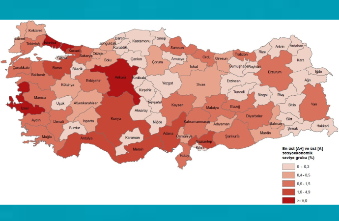 Buna göre Türkiye’de en üst ve üst sosyoekonomik seviye gruplarındaki hanehalklarının oranı büyük şehirlerde en yüksek.
