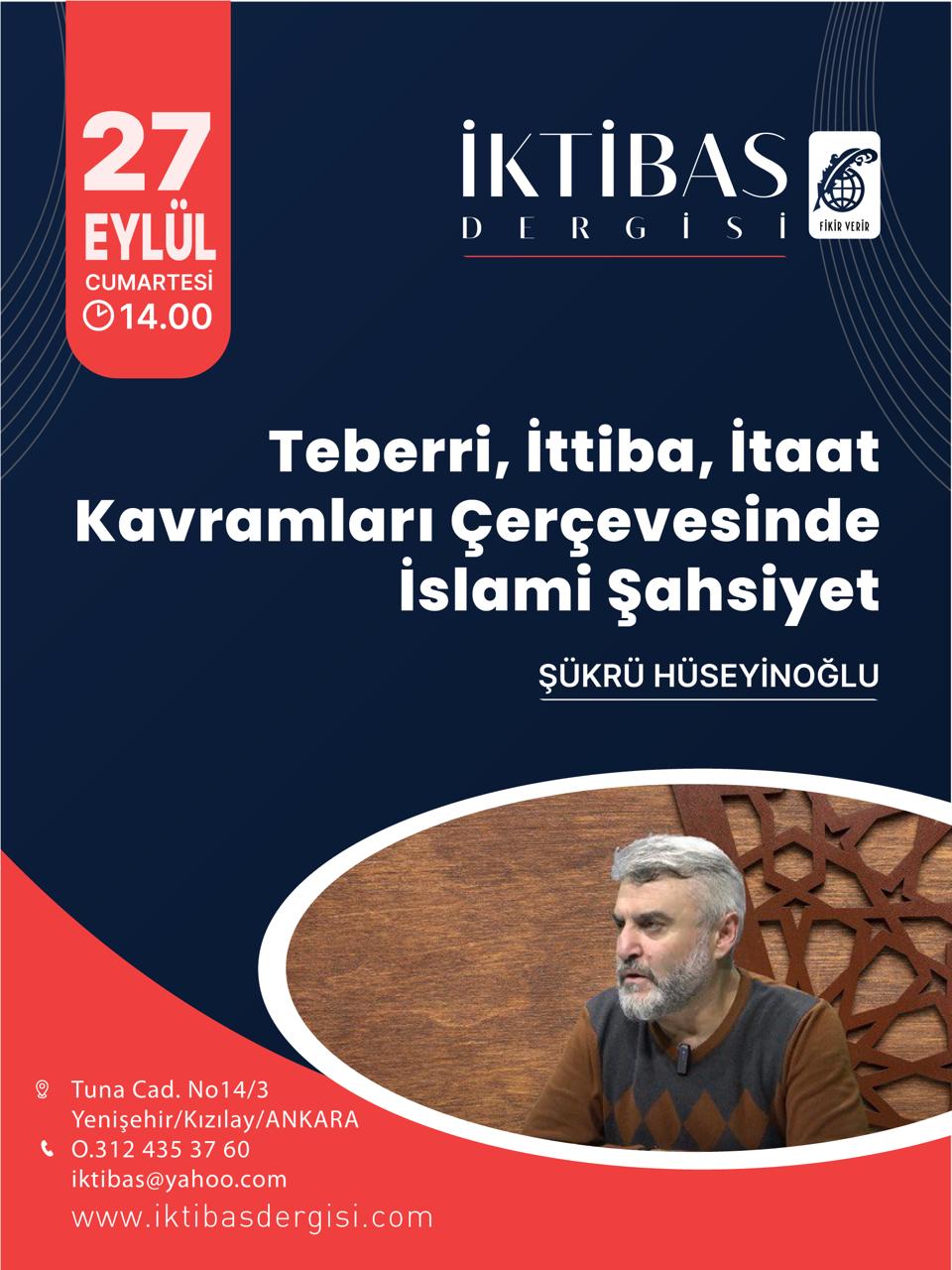 İktibas Dergisi’nin Ankara’daki merkezinde bu sezon planlanan programların ilki, önümüzdeki cumartesi günü, dergimiz yazarlarından Şükrü Hüseyinoğlu’nun katılımı ile gerçekleşecektir inşallah.