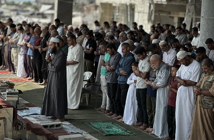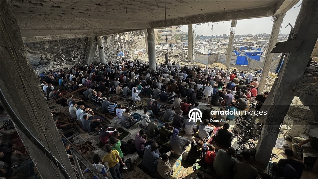 İsrail ordusunun ateşkesin ardından çekildiği Gazze Şeridi’nin orta kesiminde yer alan Nuseyrat Mülteci Kampı’nda cuma namazı kılındı. Bölge sakini çok sayıda Filistinli, kamptaki Faruk Camii’nde ve çevresinde saf tuttu.