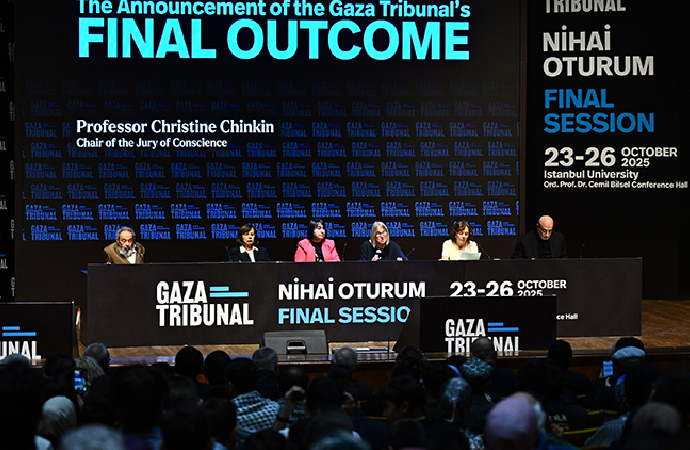 İstanbul Üniversitesi Prof. Dr. Cemil Bilsel Konferans Salonu’nda eski Birleşmiş Milletler (BM) Filistin Özel Raportörü Prof. Dr. Richard Falk başkanlığında toplanan Gazze Mahkemesi üyeleri, nihai kararını duyurdu.
