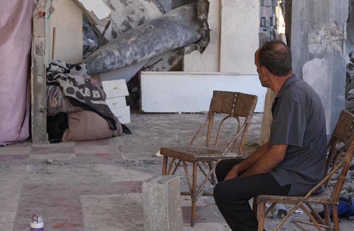 “Gidecek yerim yok ki nereye gideyim. Gazze’nin tamamı zaten harabeye dönmüş durumda. Başta kız kardeşimin evine sığınmıştım, o ev yıkıldı. Diğer kardeşimin yanına gittim, orası da bombalandı. Sonra güneye gittim. Sonunda ateşkes olunca geri geldim ve evimi bu halde buldum: Duvar yok, hiçbir şey yok, her yer yıkılmış. Üstümüze almaya bir battaniye, yatmaya bir yatak bile yok.