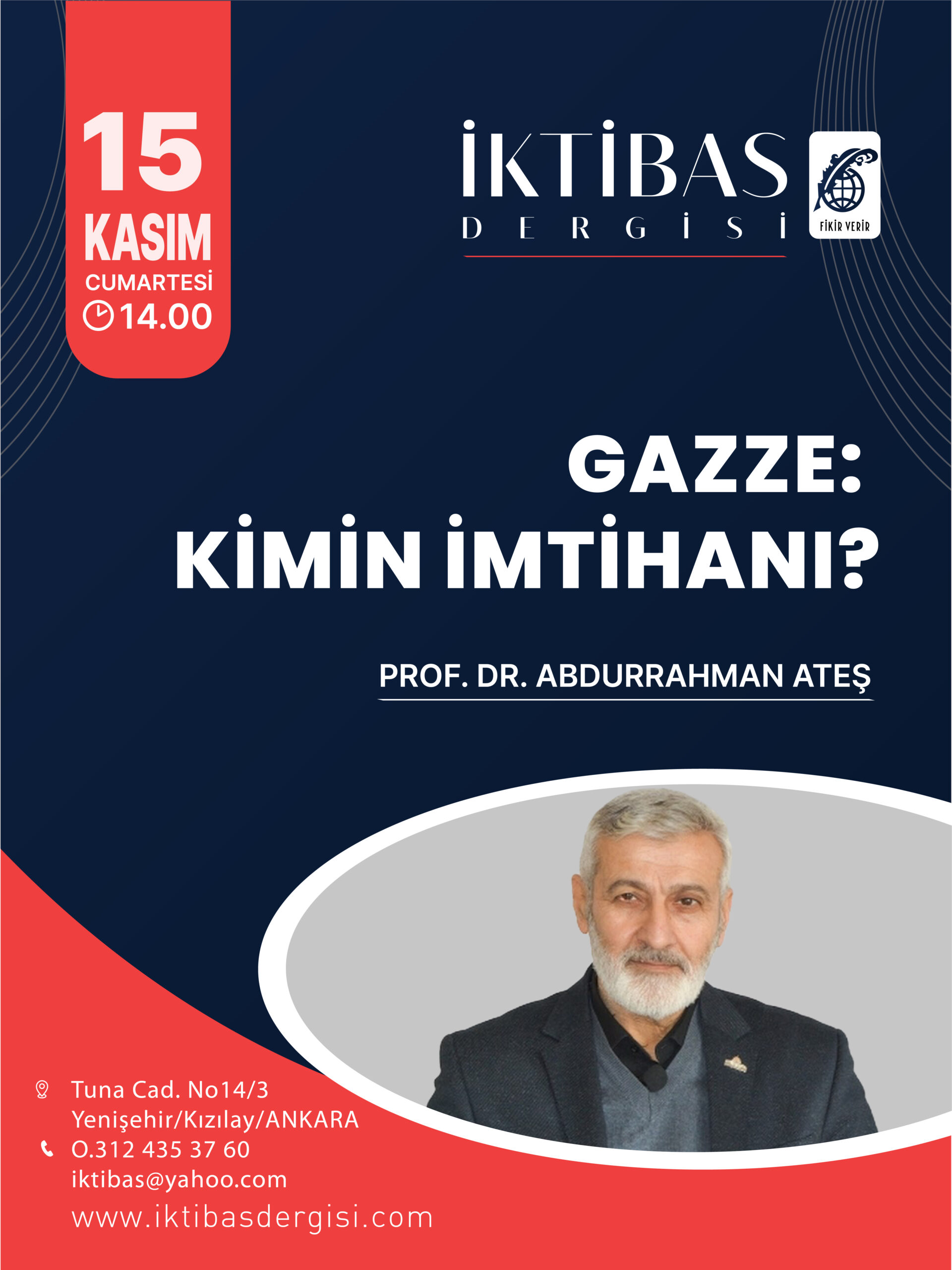 İktibas Dergisi aylık programlarında bu ayın konuğu Prof. Dr. Abdurrahman Ateş olacak inşallah. 15 Kasım Cumartesi saat 14’te başlayacak programın konusu “Gazze: Kimin İmtihanı?” olarak belirlendi.