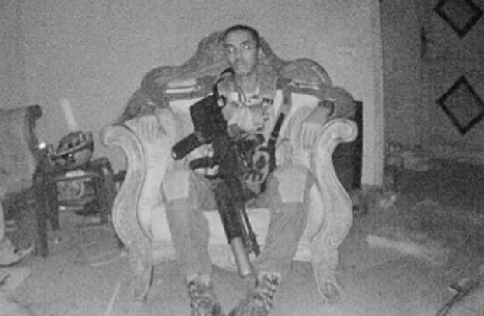 Fotoğrafta, S.D. adlı asker, Gazze’de elleri kelepçeli çıplak vaziyette yerde oturan bir adamın hemen yanında elinde silahı ile otururken görülüyor.