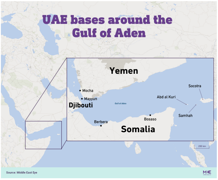 MEE tarafından analiz edilen uydu görüntüleri, şu anda Yemen’in Güney Geçiş Konseyi tarafından yönetilen Sokotra takımadalarının bir parçası olan Abd al-Kuri ve Samhah adalarında, Yemen’deki Mocha’da ve dünya petrolünün yüzde 30’unun taşındığı Bab al-Mandab boğazındaki volkanik ada Mayun’da askeri istihbarat operasyonlarının varlığını gösteriyor.