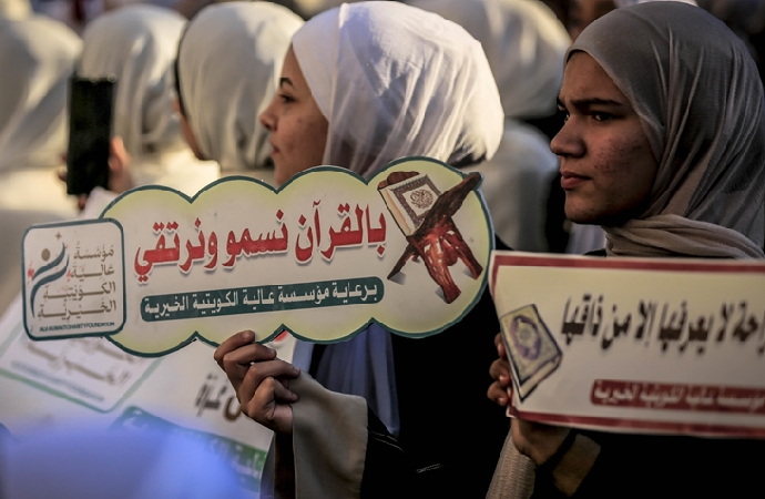 Gazze Şeridi’nin kuzeyindeki Şati Mülteci Kampı’nda düzenlenen törene erkek ve kadınlardan oluşan 500 Kur’an hafızı katıldı.