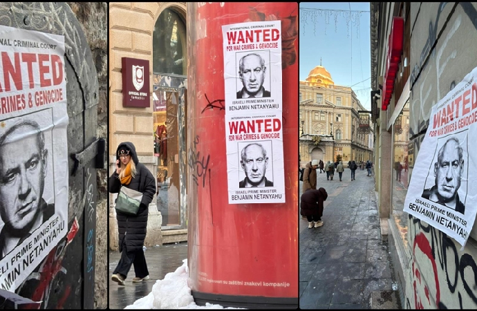 Bosna Hersek’in başkenti Saraybosna’da birçok yere siyonist katil için, “Binyamin Netanyahu, savaş suçları ve soykırımdan aranıyor” afişleri asıldı.