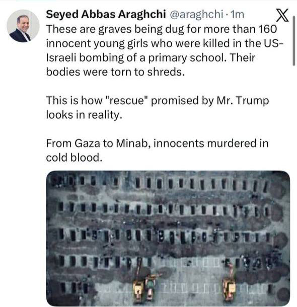 İran Dışişleri Bakanı Abbas Erakçi, X platformunda, yeni kazılmış mezar sıralarını gösteren bir fotoğraf paylaşarak, bunların ABD-İsrail’in kız okuluna düzenlediği ve 150’den fazla kişinin ölümüne neden olan ortak saldırının kurbanları için olduğunu belirtti.