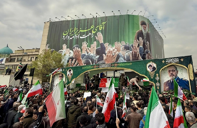 İran’da on binlerce kişi, ABD ve İsrail saldırılarında şehid edilen İranlı komutanların cenaze törenine katılmak için başkenti Tahran’daki İnkılap Meydanı’nda bir araya geldi.