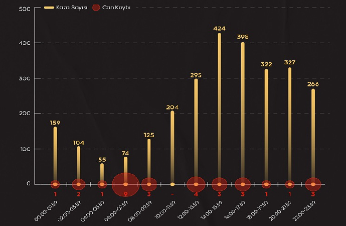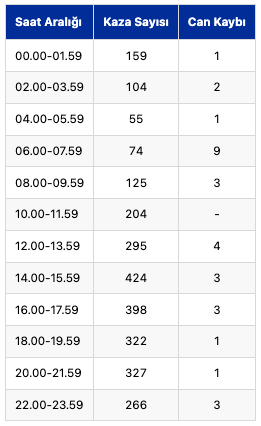 Saatlere göre kaza ve can kayıpları sayısı şöyle: