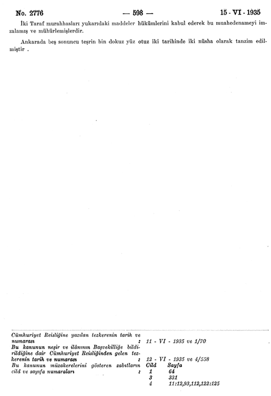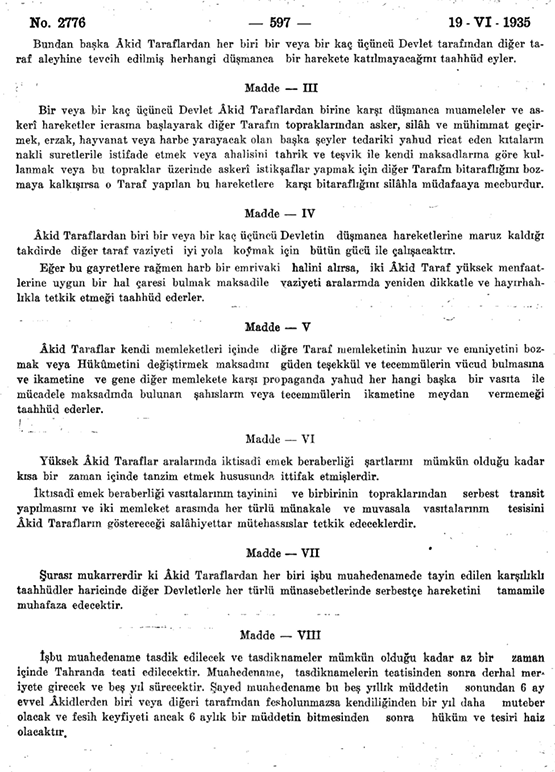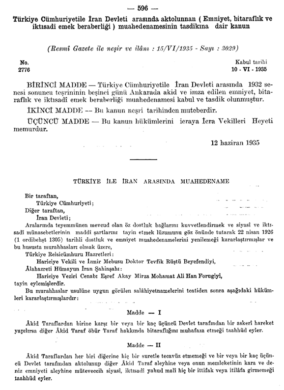 Türkiye ile İran arasında 5 Ekim 1932’de Ankara’da “Emniyet, Bîtaraflık ve İktisadi Emek Beraberliği Muahedenamesi”, yani “Güvenlik, Tarafsızlık ve Ekonomik İşbirliği Andlaşması” imzalanmış ve Büyük Millet Meclisi’nin 10 Haziran 1935’te onayladığı andlaşma 15 Haziran’da Resmi Gazete’de yayınlanarak Türkiye açısından yürürlüğe girmişti.