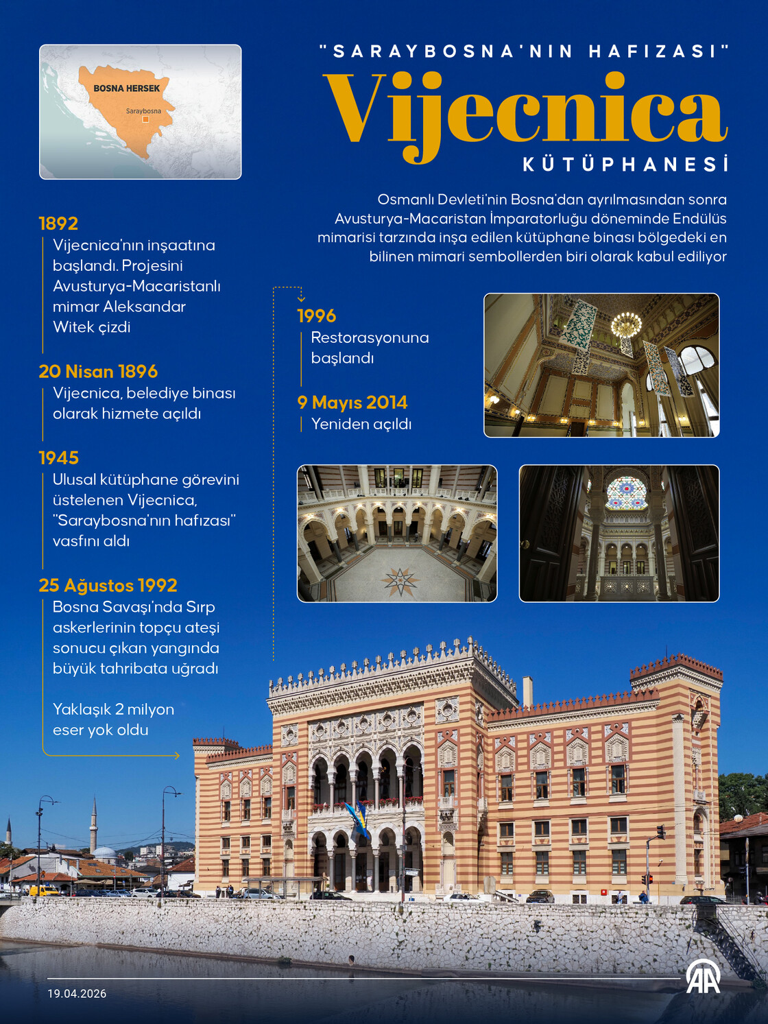Törenle 20 Nisan 1896’da hizmete açılan Vijecnica, İkinci Dünya Savaşı’nın bitimiyle belediye binası işlevini yitirdi. 1945’te ulusal kütüphaneye dönüştürülen yapı, o günden bu yana “Saraybosna’nın hafızası” olarak biliniyor.