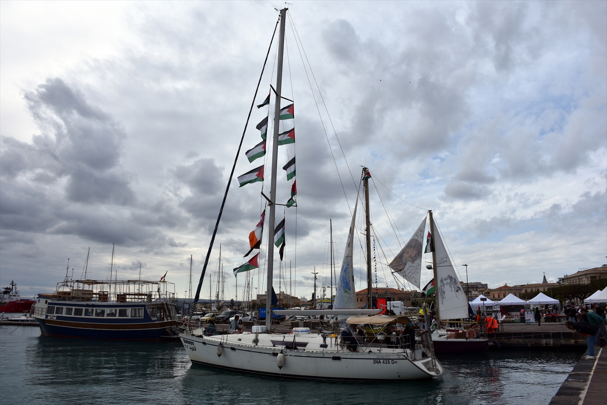 Direklerine Filistin bayrakları çekilmiş ve Filistin’e özgü motiflerle süslenmiş yelkenleriyle tekneler, bu akşam saatlerinde Siracusa Limanı’na yanaştı. Sahildeki Filistin destekçileri, limana giriş yapan tekneleri, “Özgür Filistin” tezahüratlarıyla karşıladı.